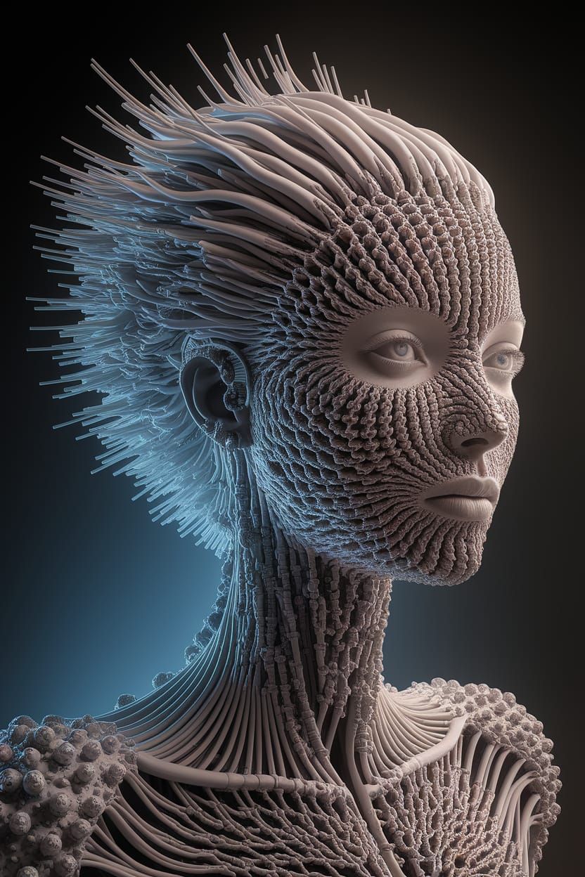 This image shows a complex data signal manifesting as a beautiful woman. The visualization features recurring sequences and patterns embedded within temporal amplitude envelopes.