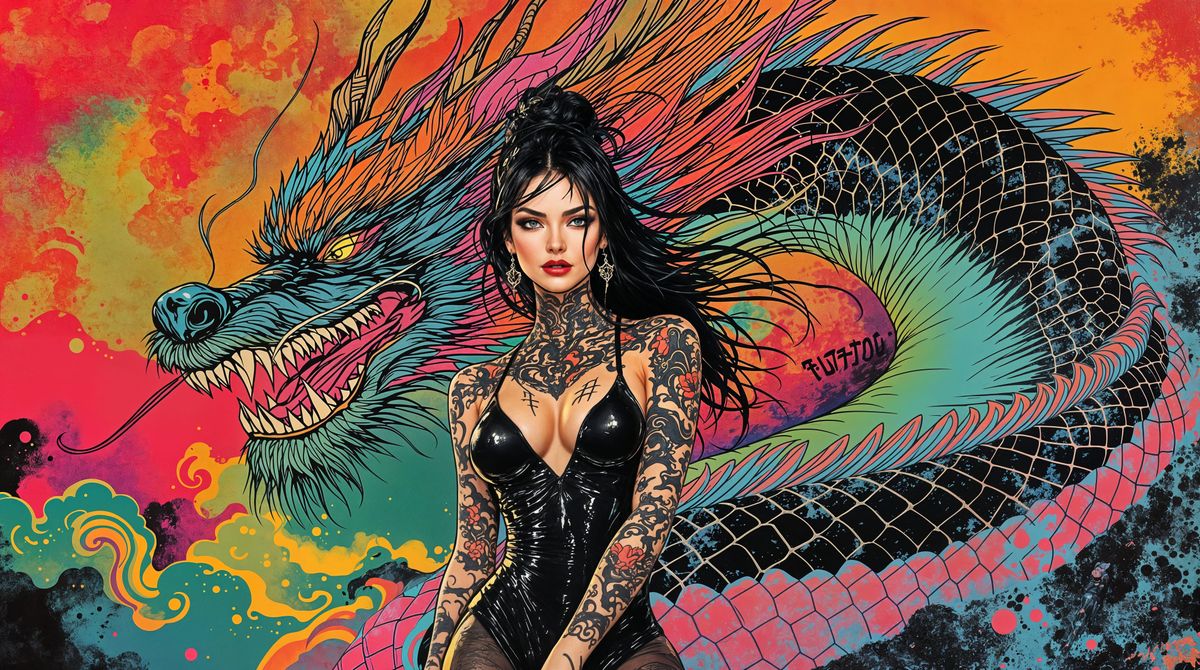This image depicts a stunning woman posing as a fierce warrior alongside a majestic Chinese dragon, both set against a dreamlike background with a matte texture mimicking melted oil on canvas. The woman's intricate tattoos and sleek black attire contrast with the dragon's glinting scales, all rendered in...