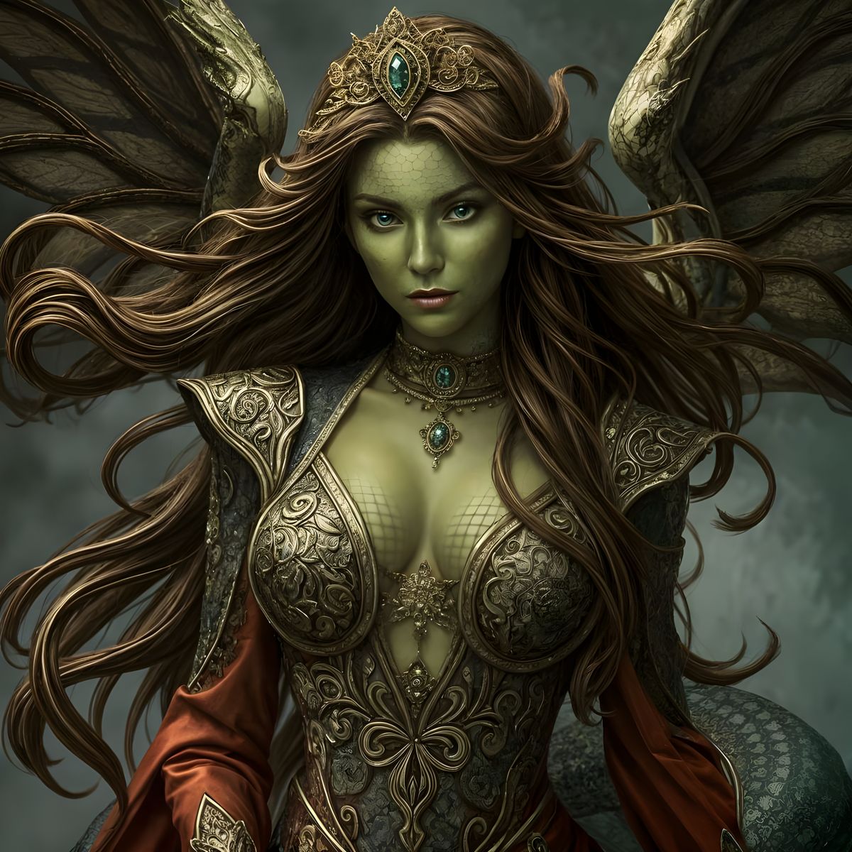 This image depicts a captivating serpent queen with flowing brown hair, dressed in ornate royal attire. She embodies a seductive yet dangerous presence.