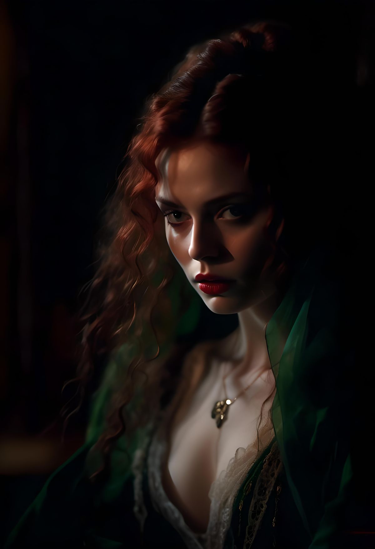 This image shows Elena as the Bride of Dracula, wearing a green velvet gown from the 15th century. The painting captures her glamour with super dramatic lighting, in a soft, detailed style.