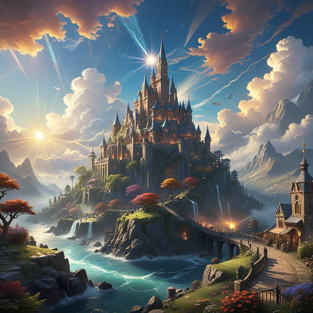 This image shows a breathtaking, ultra-detailed digital painting of a fantastical cityscape in a solar punk aesthetic, blending technology and nature in a utopian, ethereal world with intricate details and vibrant colors.