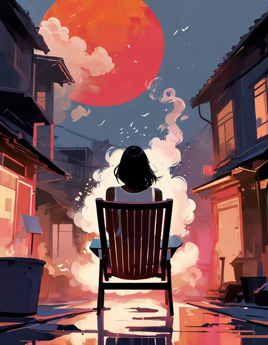 A digital painting shows a woman silhouetted against a sunset while sitting in a red chair in a narrow backstreet. Smoke rises from a cigarette in her hand. The image employs flat, color-blocked aesthetics.