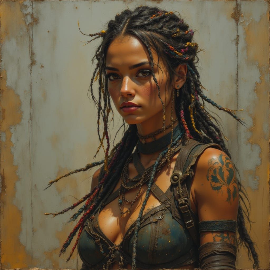 This image depicts a post-apocalyptic warrior woman with a unique hairstyle, tribal tattoos, and improvised armor. The portrait features dramatic lighting and textured, painterly details against a muted background.
