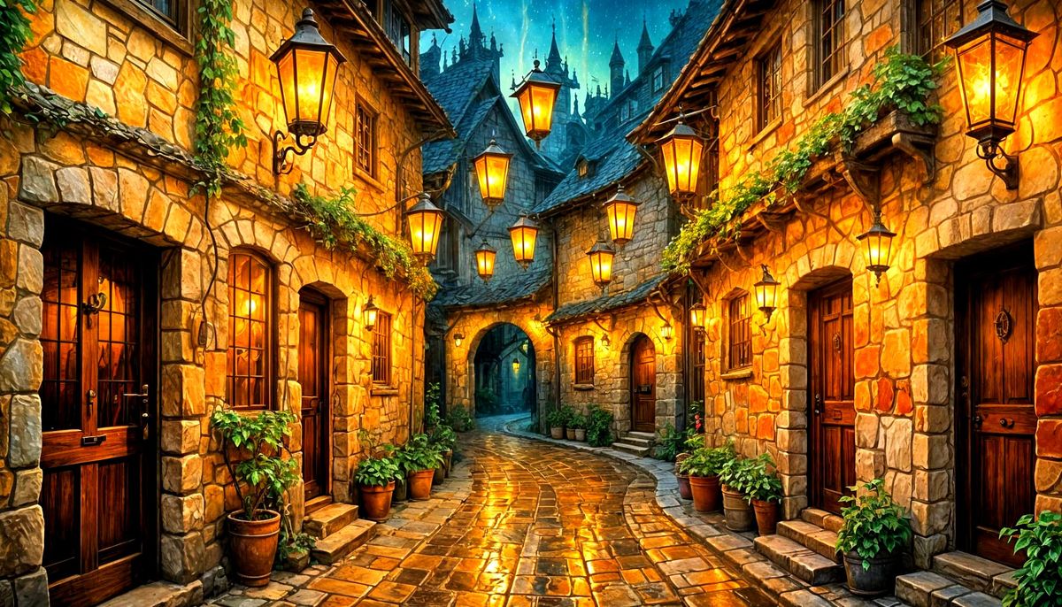 A richly textured surrealist painting of a narrow medieval street at night. Lanterns cast a warm glow on a rainy evening, highlighting a rustic inn and shadowy corners.