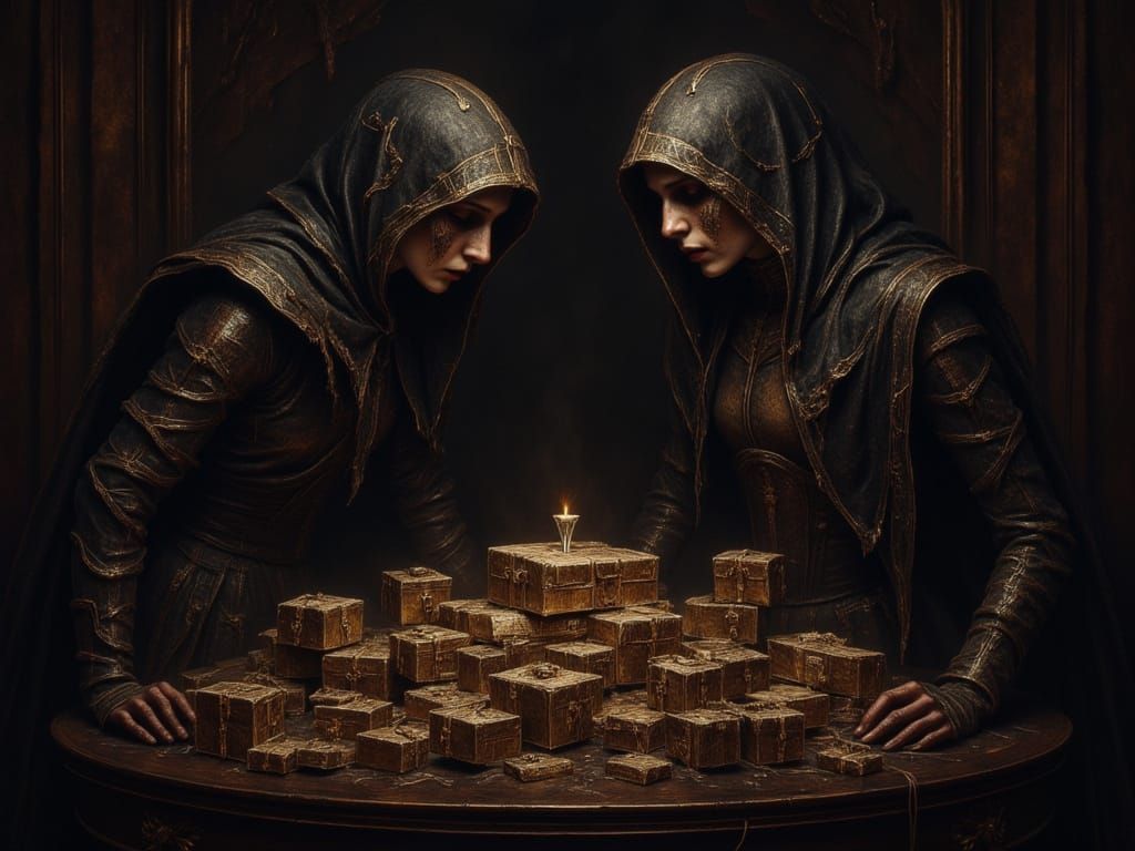 This concept art shows two figures in a dimly lit room, focused on intricate boxes resting on a table. Dynamic lighting and detailed splash art create a compelling scene.