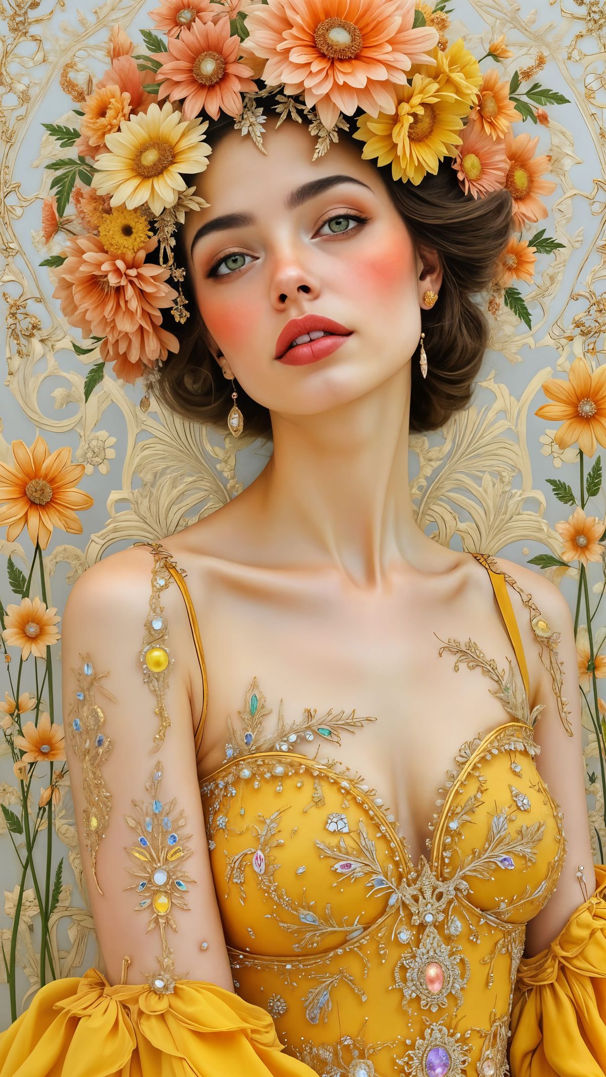 A shimmering portrait of a woman in a jeweled dress adorned with flowers. The soft, iridescent pastel colors evoke the freshness of spring in an art nouveau style.
