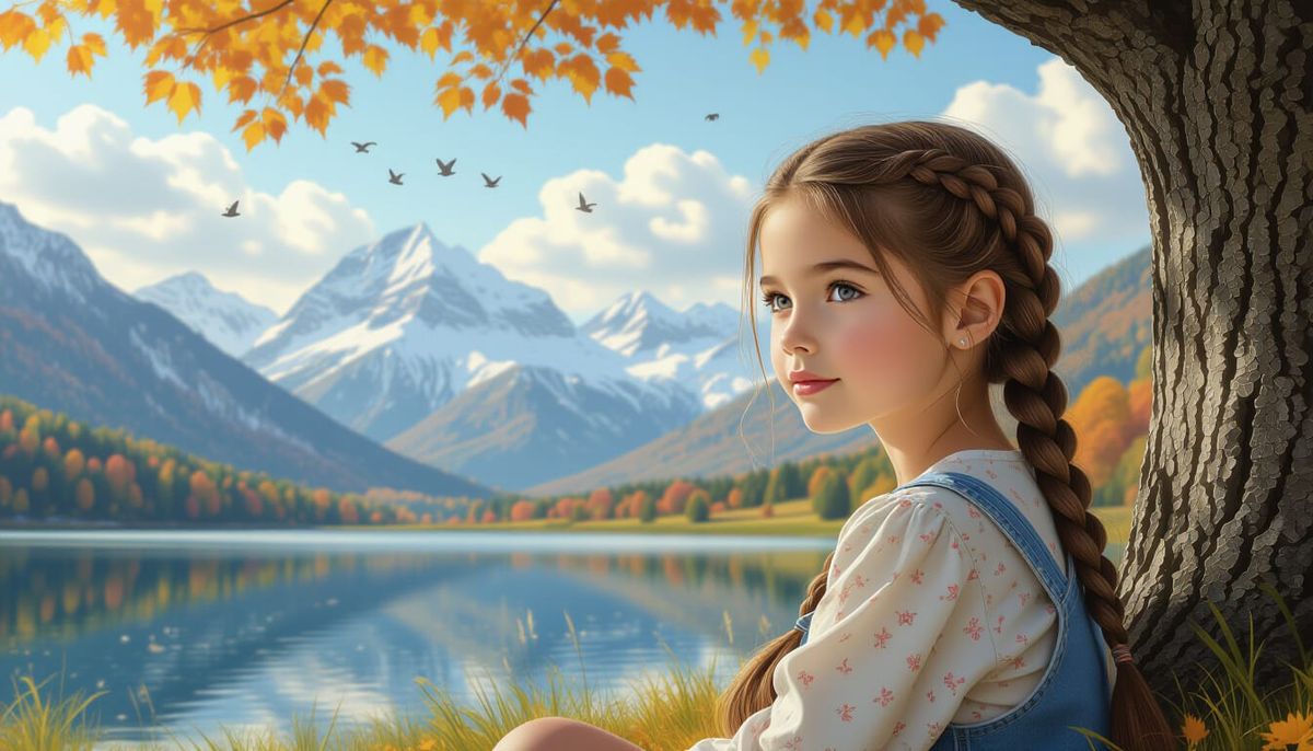 This image shows a brunette girl with braided hair sitting under a tree, looking back. A picturesque countryside with snow-capped mountains, reflective water, and birds completes the photorealistic illustration.