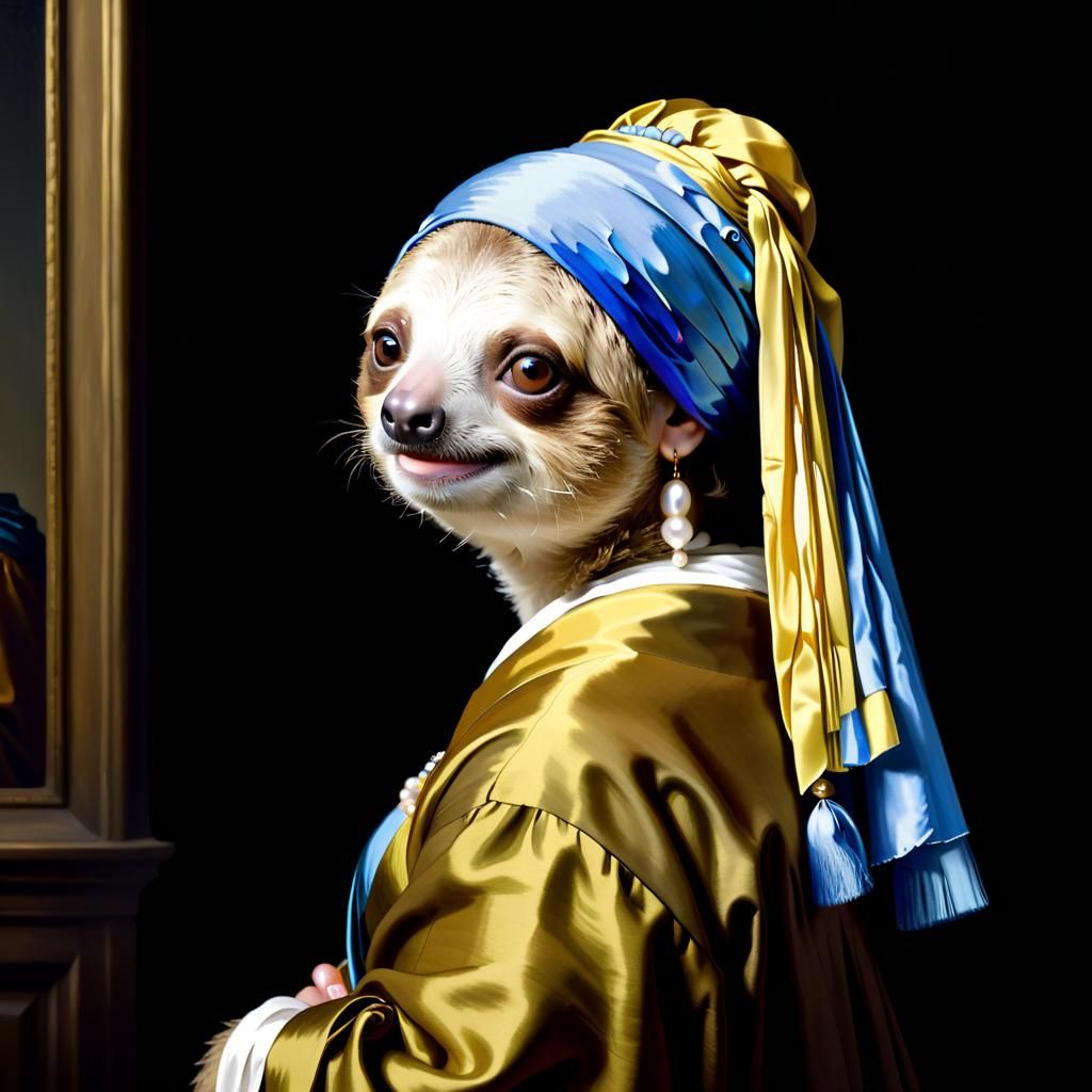 This image shows a sloth posing as the subject of "Girl with a Pearl Earring". The artwork is reminiscent of baroque-era Dutch Masters.
