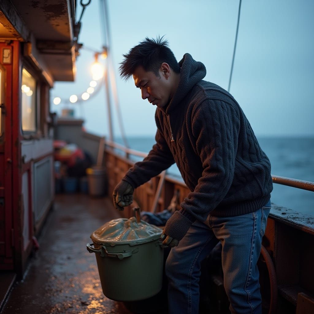 A striking picture of a 30-year-old Asian man working on a deep-sea fishing boat at dusk. The image uses vibrant colors and dramatic lighting to capture the scene in a documentary style.