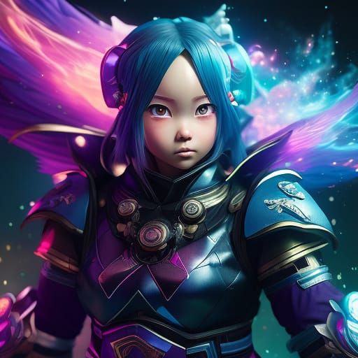 This 3D anime artwork showcases a chubby superhero named M, radiating graceful cosmic energy. A masterpiece concept art with vibrant blues and purples, inspired by WLOP and Genshin Impact.
