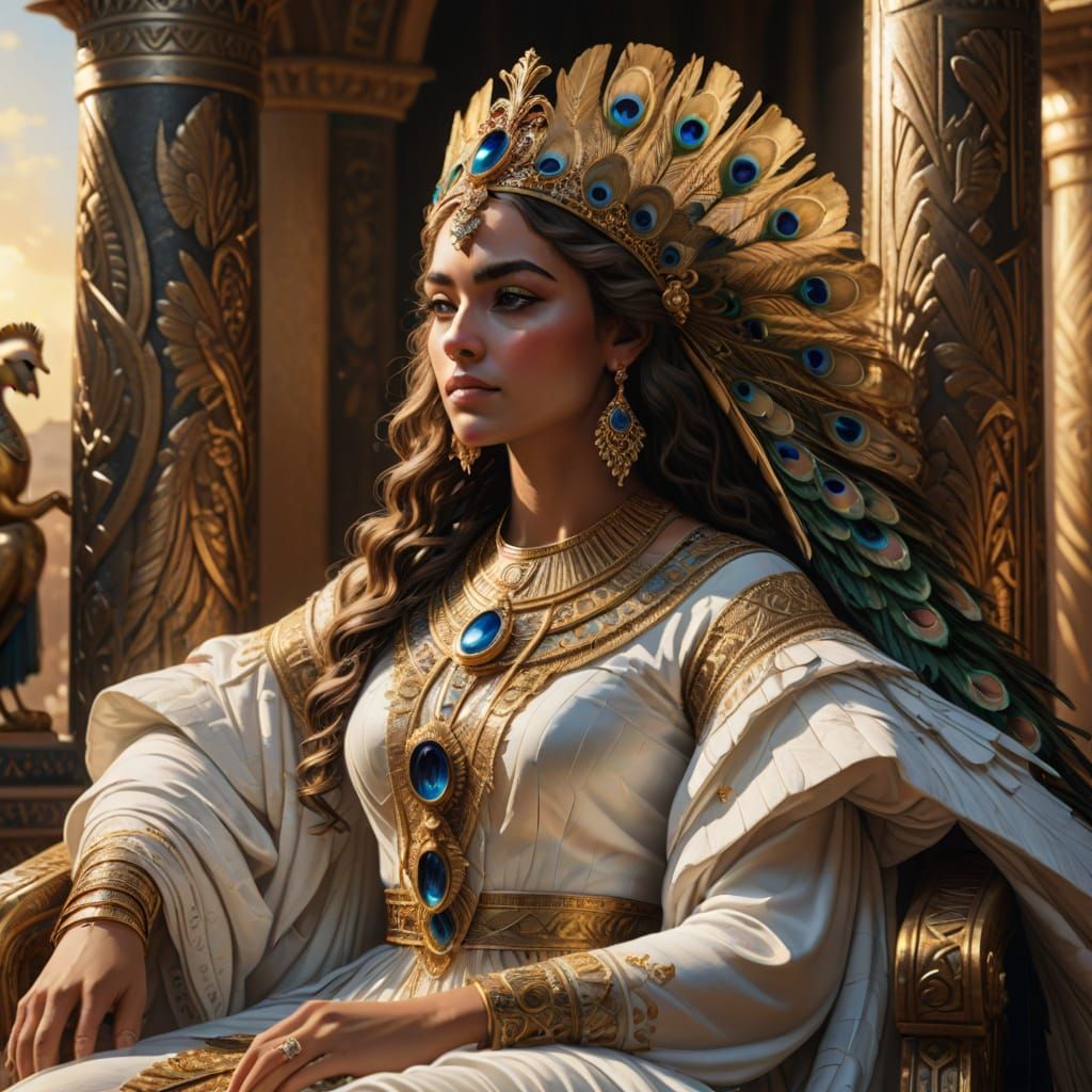 This image depicts an ancient Egyptian queen sitting majestically on a throne, surrounded by the vibrant plumage of a peacock and the soft folds of her white gown. The classical art style and golden light of sunset create a serene atmosphere, exuding elegance and historical accuracy.