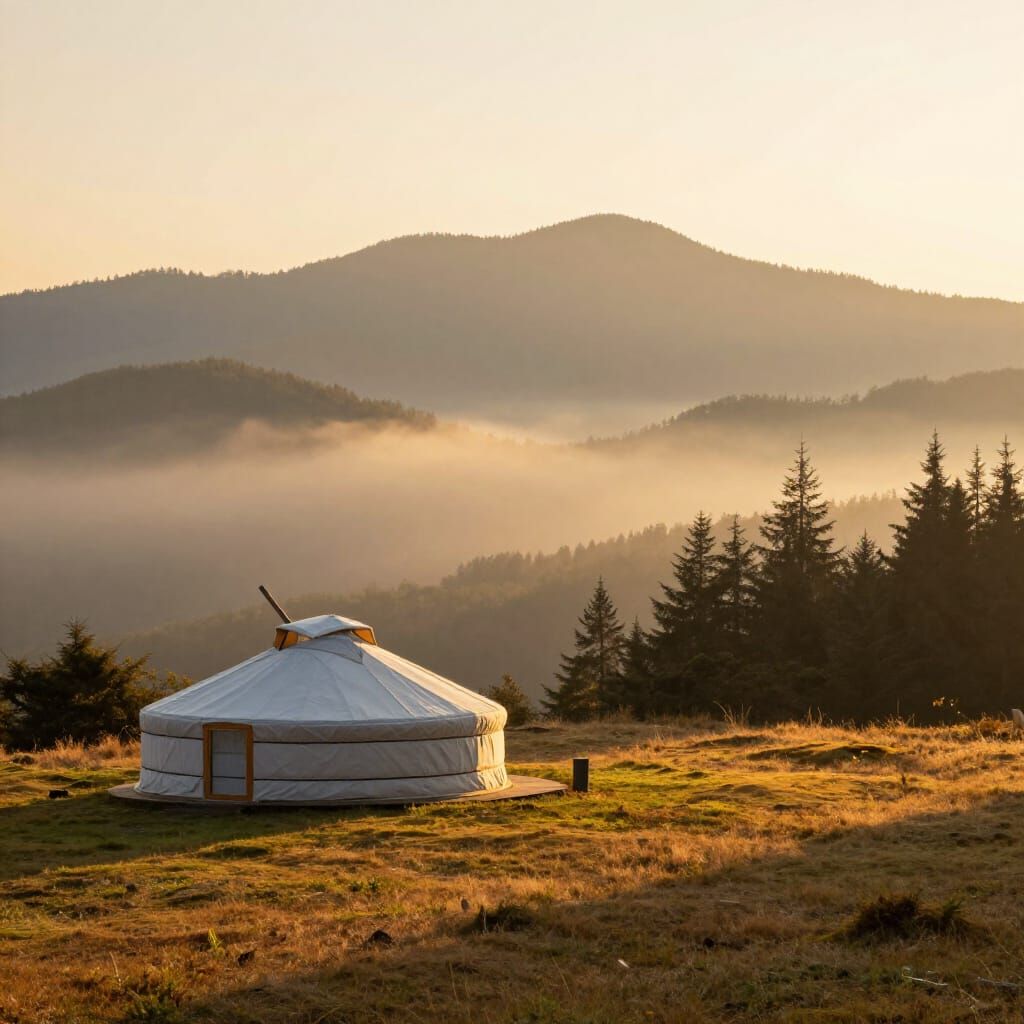 This image shows two flat acres in the misty Appalachian Mountains with a yurt, bathed in golden hour light. Rendered in a realistic matte painting style, it emphasizes natural beauty.