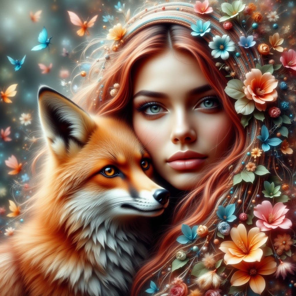 This image shows a mystical, dreamy scene of a beautiful woman and her pet fox, crafted from intricately folded origami paper in a soft, 8K resolution, 64 megapixel, papercraft style.