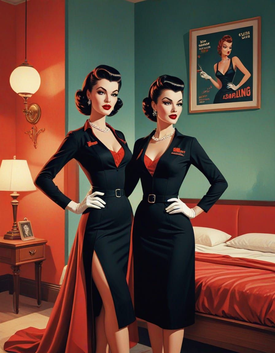 This illustration features two fashionable vampire women posing back to back in a cozy, vintage room. Bold typography and a double exposure technique enhance this mid-century cartoon magazine style artwork.