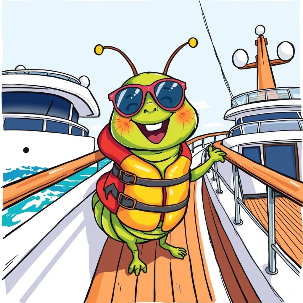 A cheerful cartoon caterpillar in sunglasses and a life jacket enjoys a yacht ride. This hand-drawn style image features bold lines and textures, with exaggerated, expressive features.