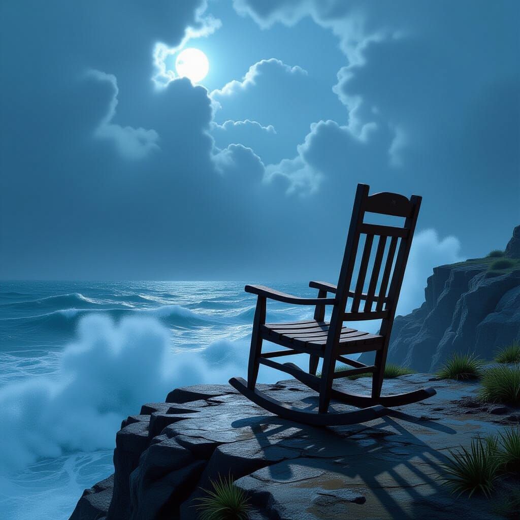 This image shows a solitary rocking chair perched on a cliffside as a storm rages. The scene is reminiscent of concept art, with dramatic lighting and cinematic textures, rendered as 3D digital art.