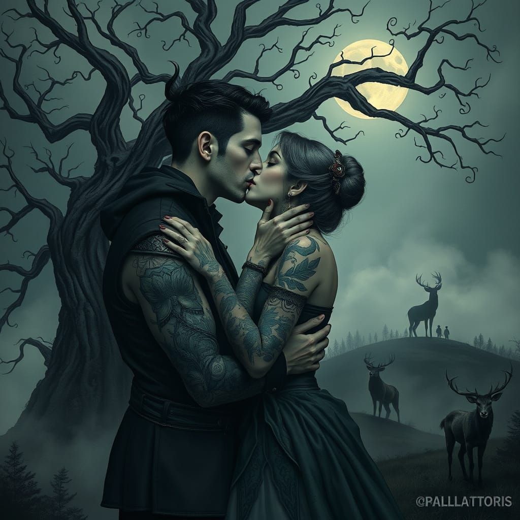 A hauntingly realistic painting of a tattooed couple embracing in a dark forest, illuminated by soft moonlight and surrounded by twisted trees, fog, and watching wildlife, with intricate details and muted colors.