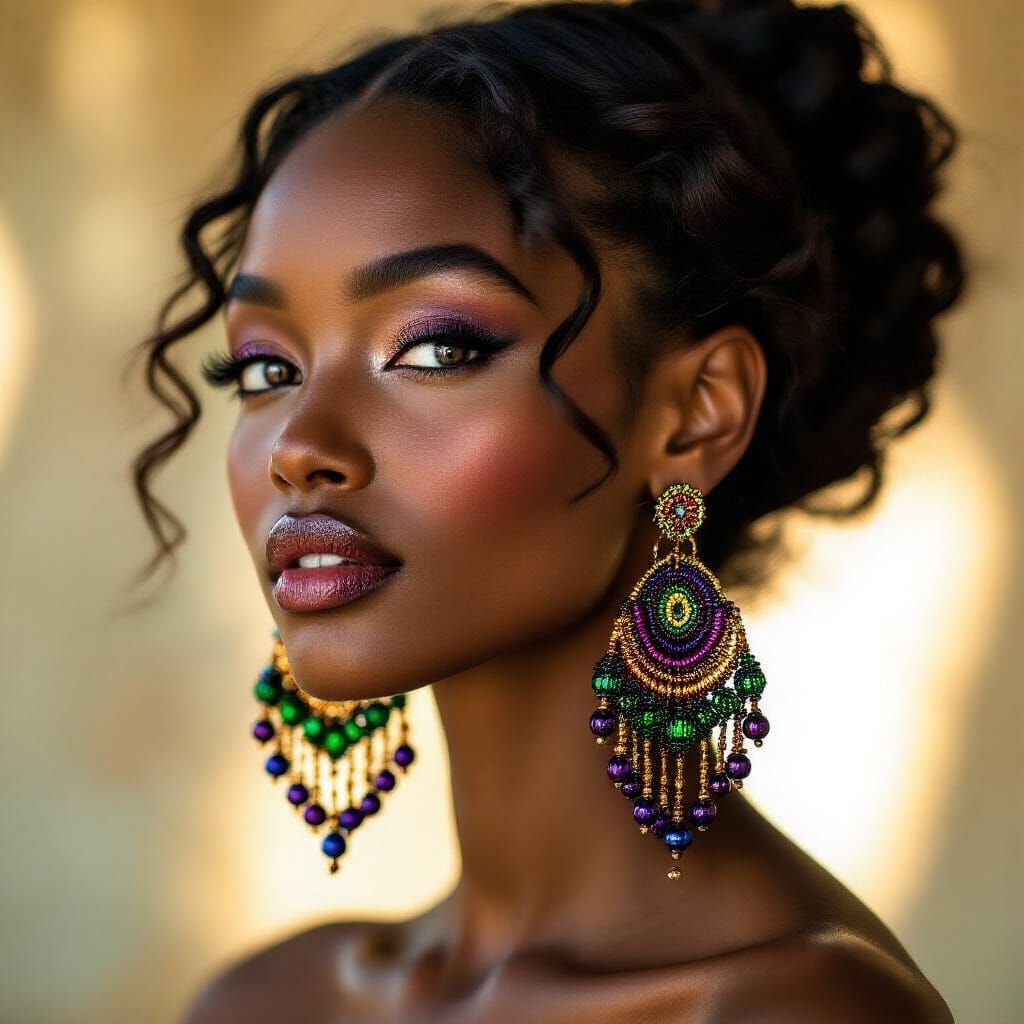 This image shows a Black woman wearing handcrafted beaded earrings. The close-up portrait captures the intricate details of the jewelry and her radiant expression, enhanced by soft lighting in an editorial photography style.