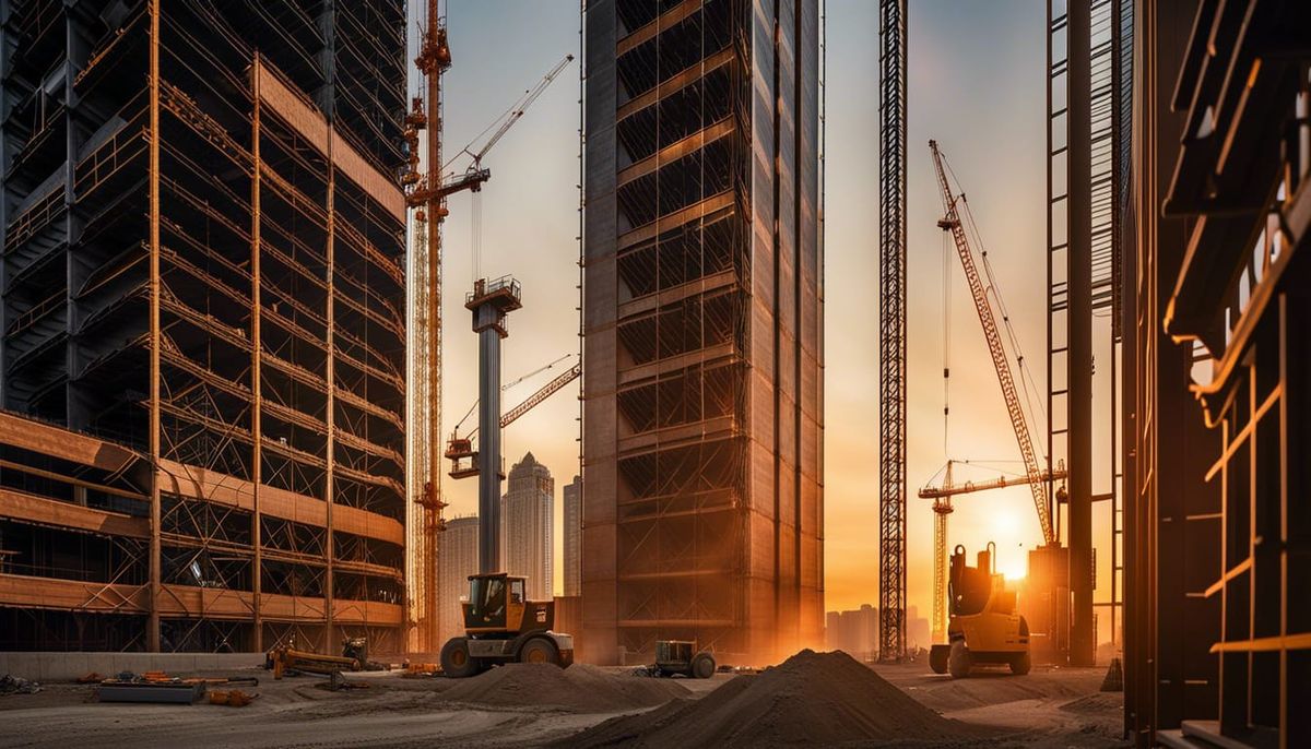 This image shows a skyscraper under construction at sunset. Cranes tower above the modern architectural design, which is surrounded by scaffolding and equipment. Warm light illuminates the textures.