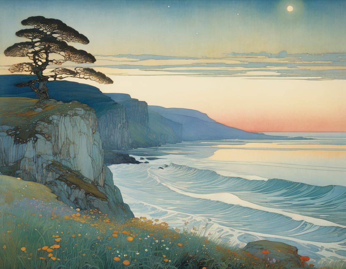 This image is a surreal blend of styles from various artists, including the Art Nouveau and Symbolist movements, featuring intricate patterns and mystical themes.