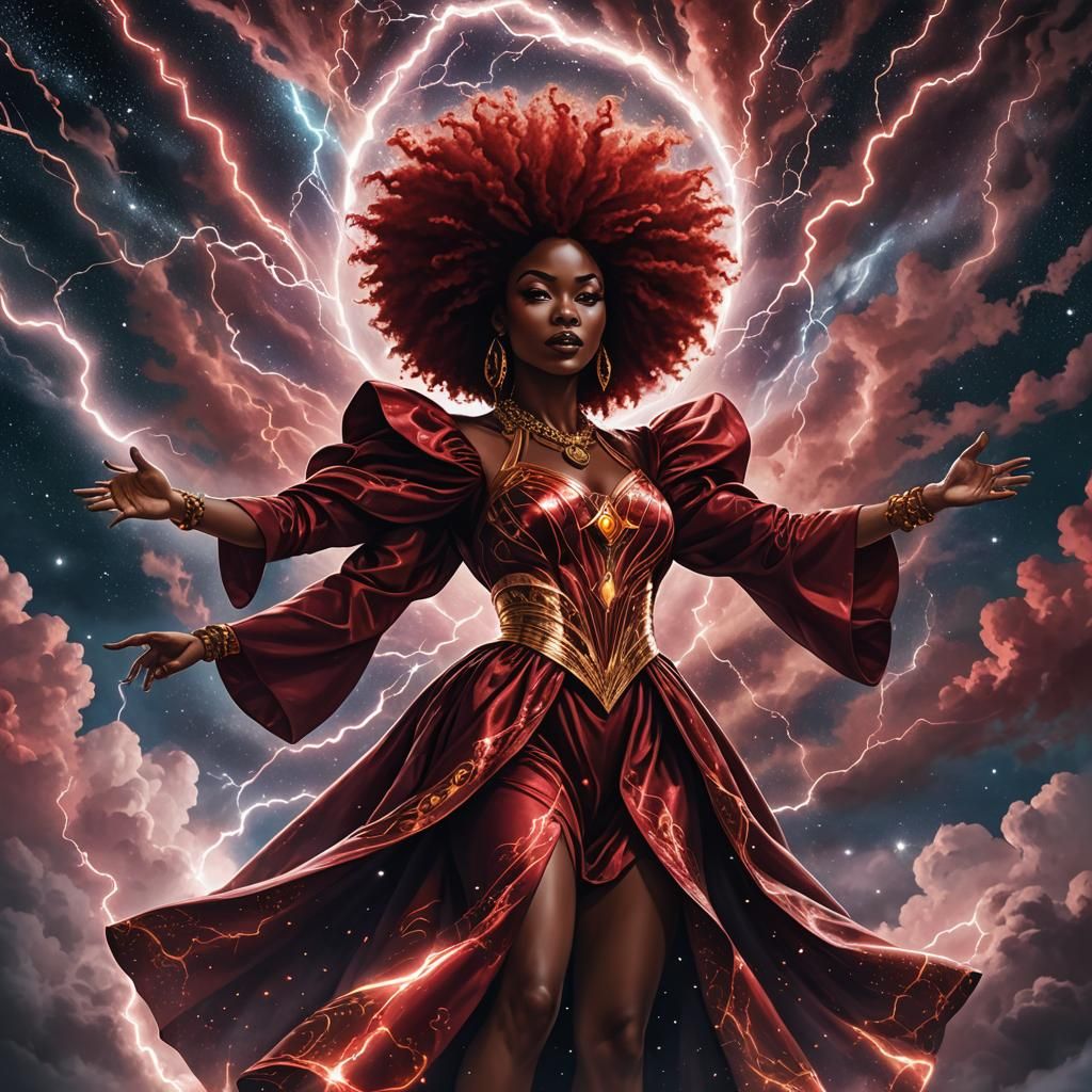 Oya wearing dark red gown, red Afro, sheโs floating through the night sky, lightning shooting out of her hands. Lightning in the night sky...