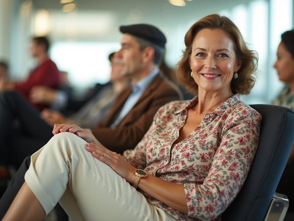 This image captures a serene moment of a matronly woman in a vibrant airport lounge, surrounded by other travelers, with a focus on her warm and gentle face. The artwork blends elements of realism and expressive brushstrokes, reminiscent of classic artists.