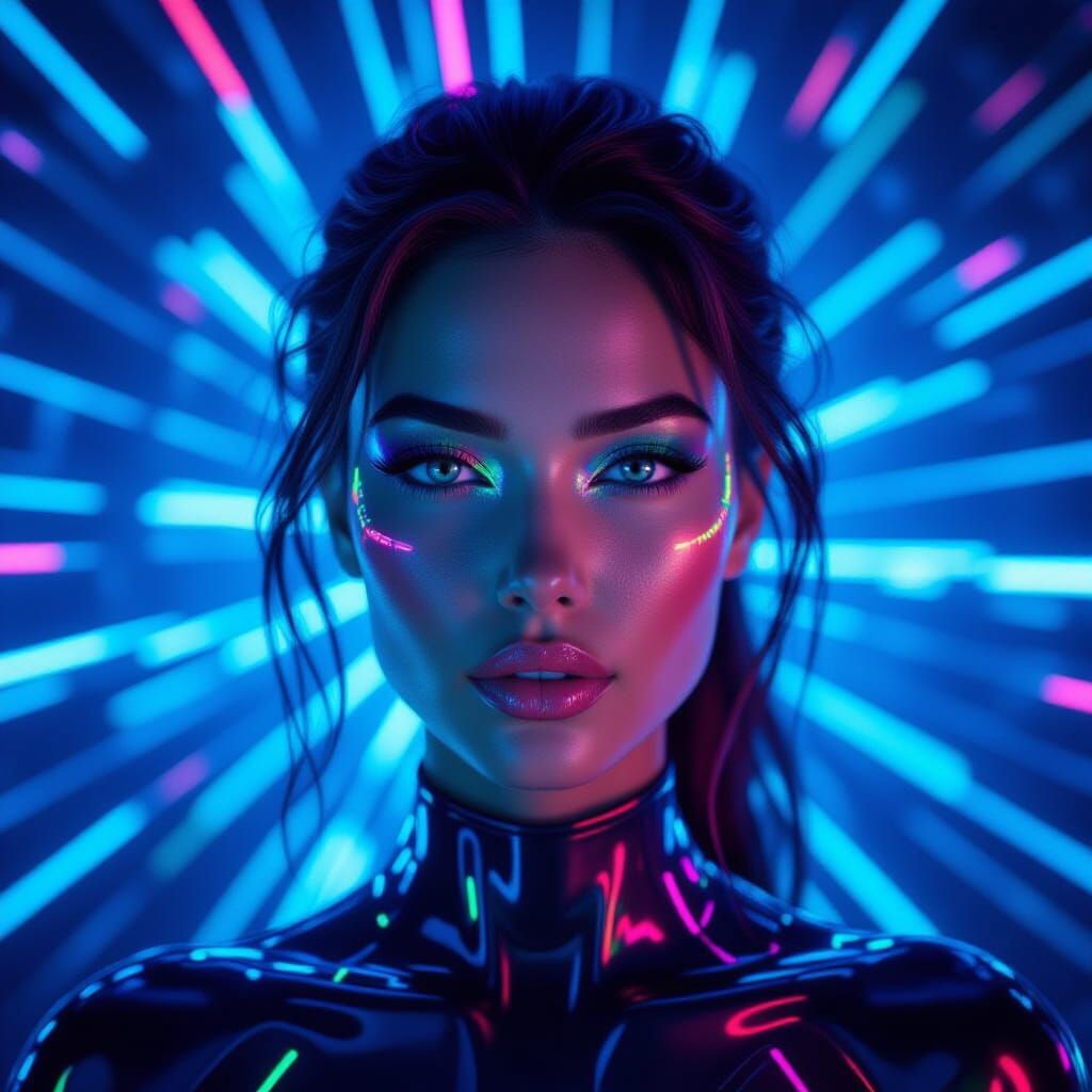This image shows a hyperrealistic portrait of a woman with glowing neon skin in blues, pinks, and greens. Cinematic lighting creates sharp highlights and deep shadows, with intricate details against a dark void.