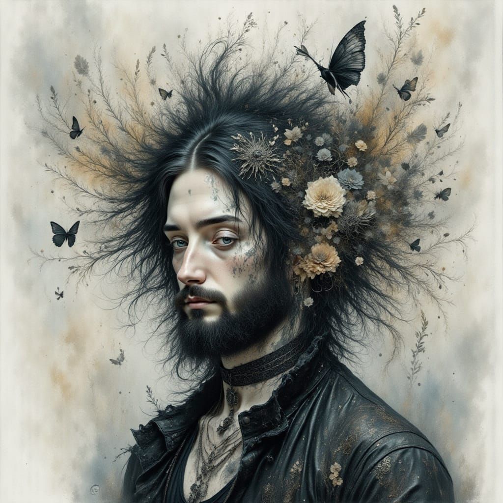 This image shows a delicate fairy rendered in watercolor and pencil. The gothic style is enhanced by smoky shading, creating a mystical and intense composition.