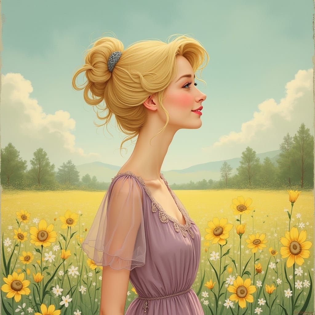 A beautiful woman smiles in a sunlit meadow filled with spring flowers. She wears a flowing pastel gown with delicate hand-sewn details, in an art nouveau style.