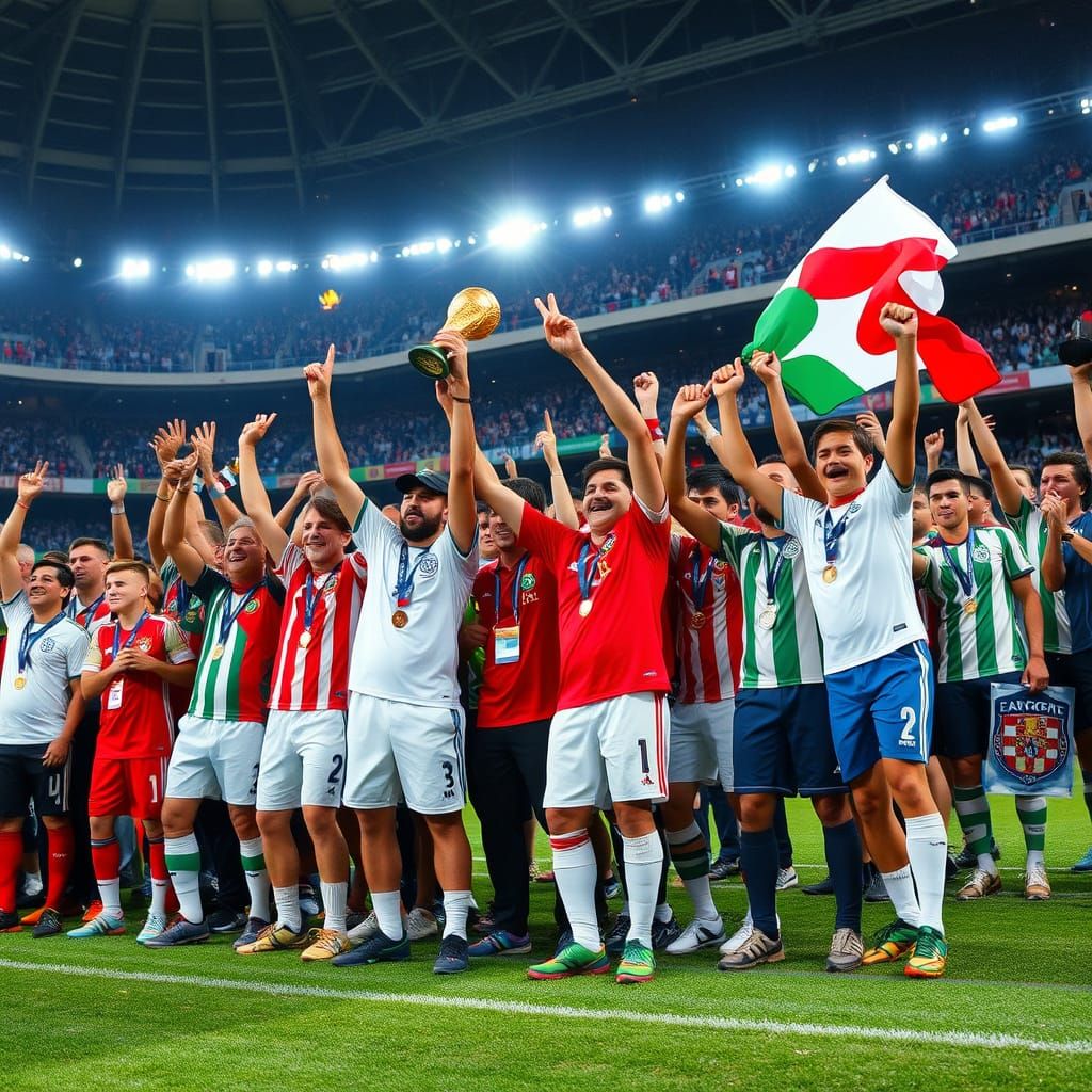 This image captures the exhilaration of a football team's World Cup triumph, as fans erupt in joy and celebration within a packed stadium.