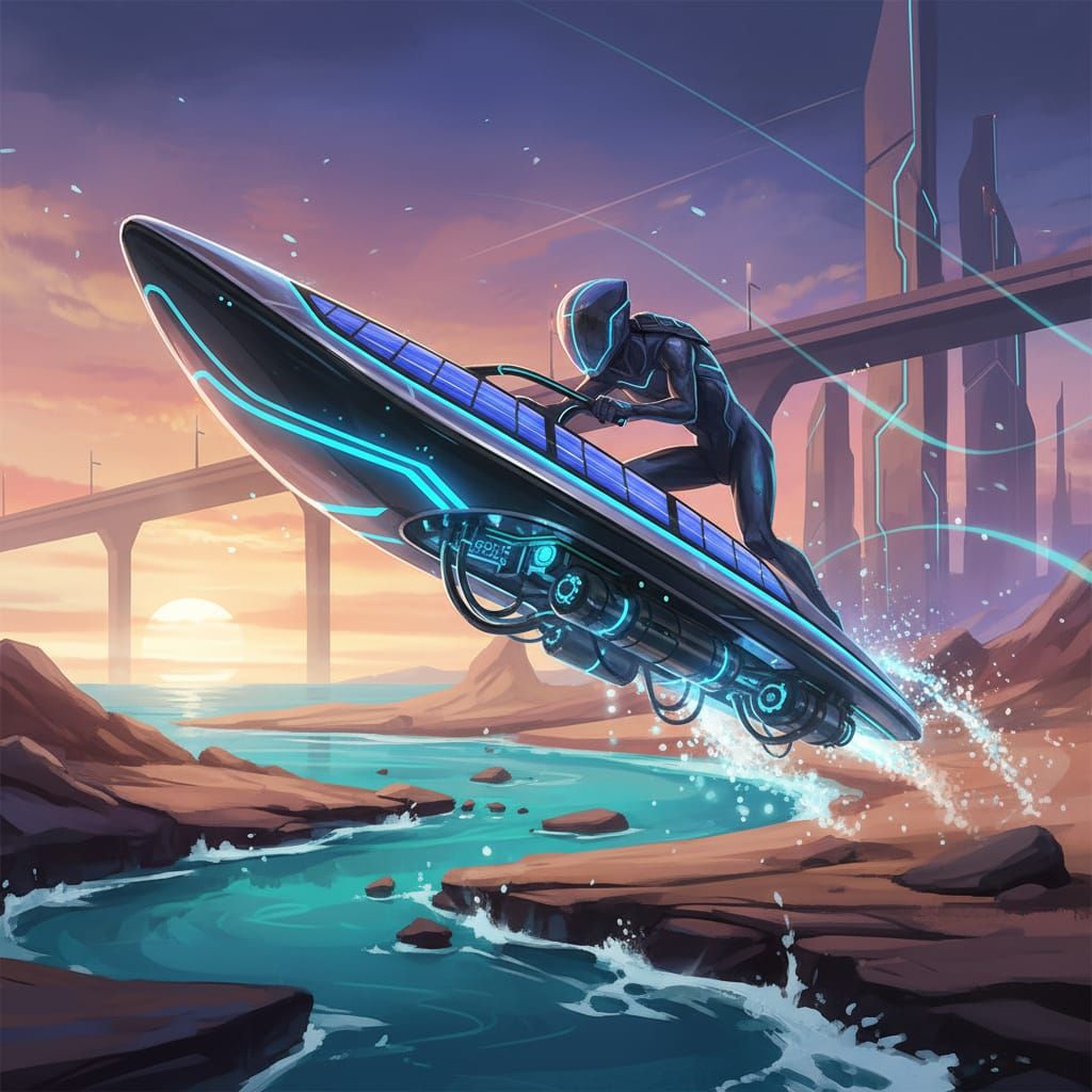 This image shows a futuristic solar surfboard hovering above land and water at high speed. The design features vibrant electric blue stripes and a dynamic, high-tech aesthetic in a retro-futuristic style.