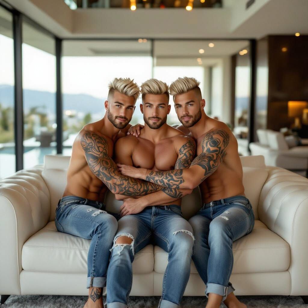 This image shows muscular blond triplets with tattoos and distinctive hairstyles, posing closely together on a white leather couch in a luxurious mansion. Cinematic lighting enhances the opulent scene, captured in photorealistic 8K detail.