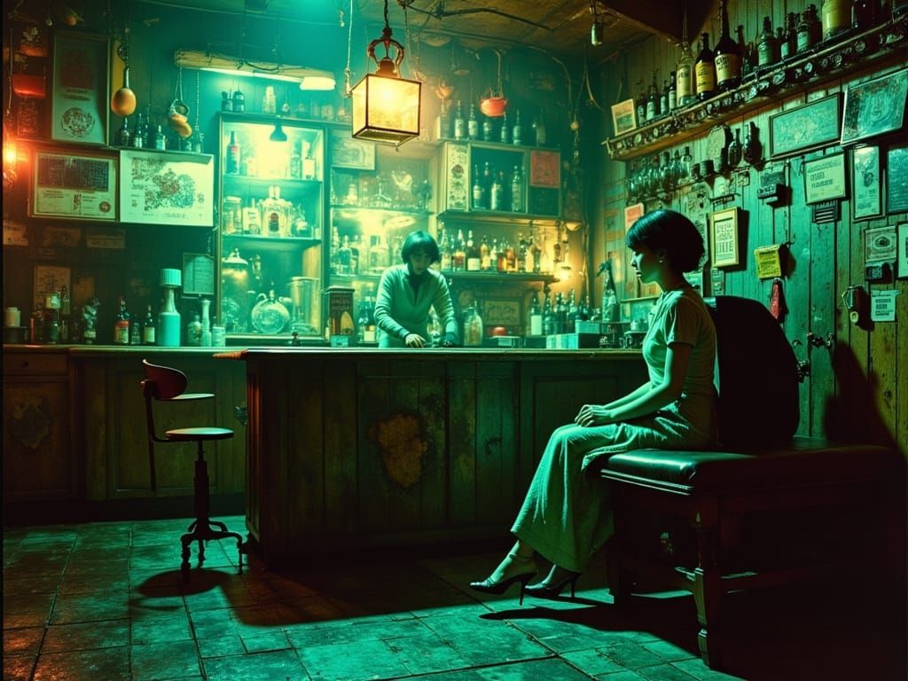 This detailed lomography image showcases a multicultural alien cyber bar with intricate textures and sharp focus, rendered in a striking turquoise and marine color palette.