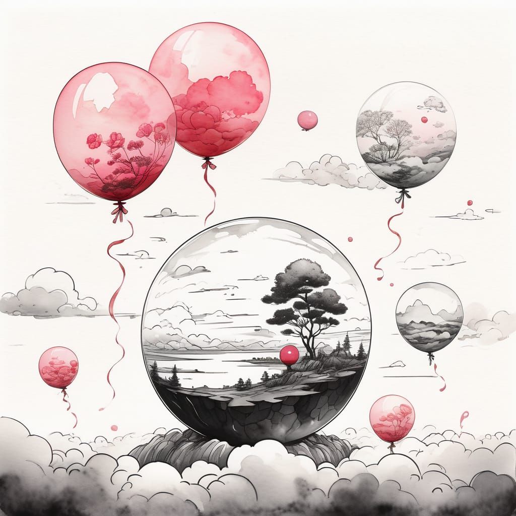 A black and white ink wash illustration of a glass ball containing a microcosmos being carried above the clouds. The image features soft focus and delicate lines.