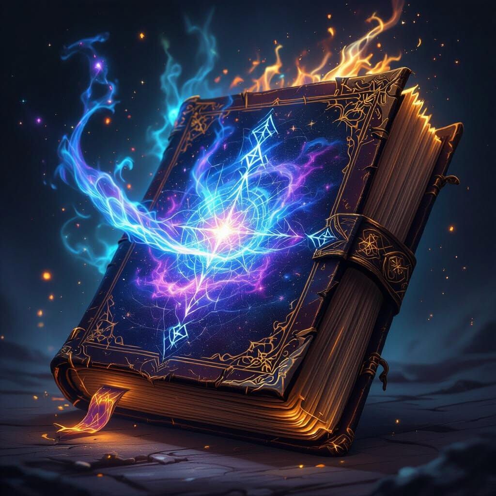 This image shows an ancient, glowing magic book with arcane symbols and swirling nebulae. Rendered in a detailed fantasy concept art style with dynamic lighting and vivid colors.