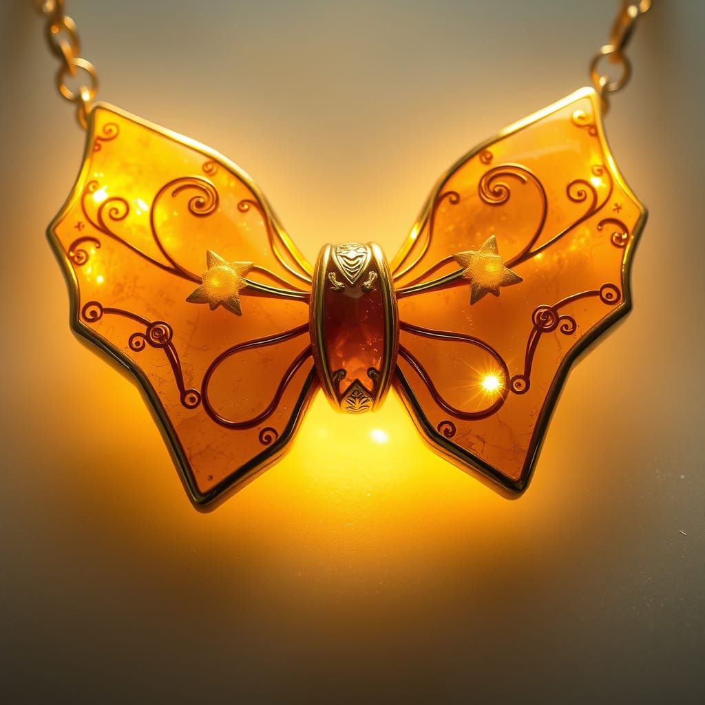 A hyperrealistic image of a radiant, bow-shaped pendant made of molten gold and sunstone. It rests on marble and glows with solar runes in a dark fantasy style.