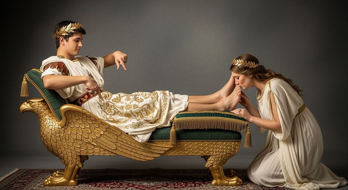 This image shows a young Roman emperor reclining on an ornate chaise lounge while a princess kisses his feet. Shot with natural lighting and sharp focus, the image is reminiscent of Neoclassical paintings.