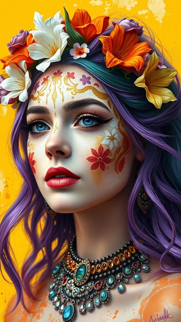 Easily create your own colorful portrait images with our free AI image generator. Add flowers to hair, vibrant colors, and more!
