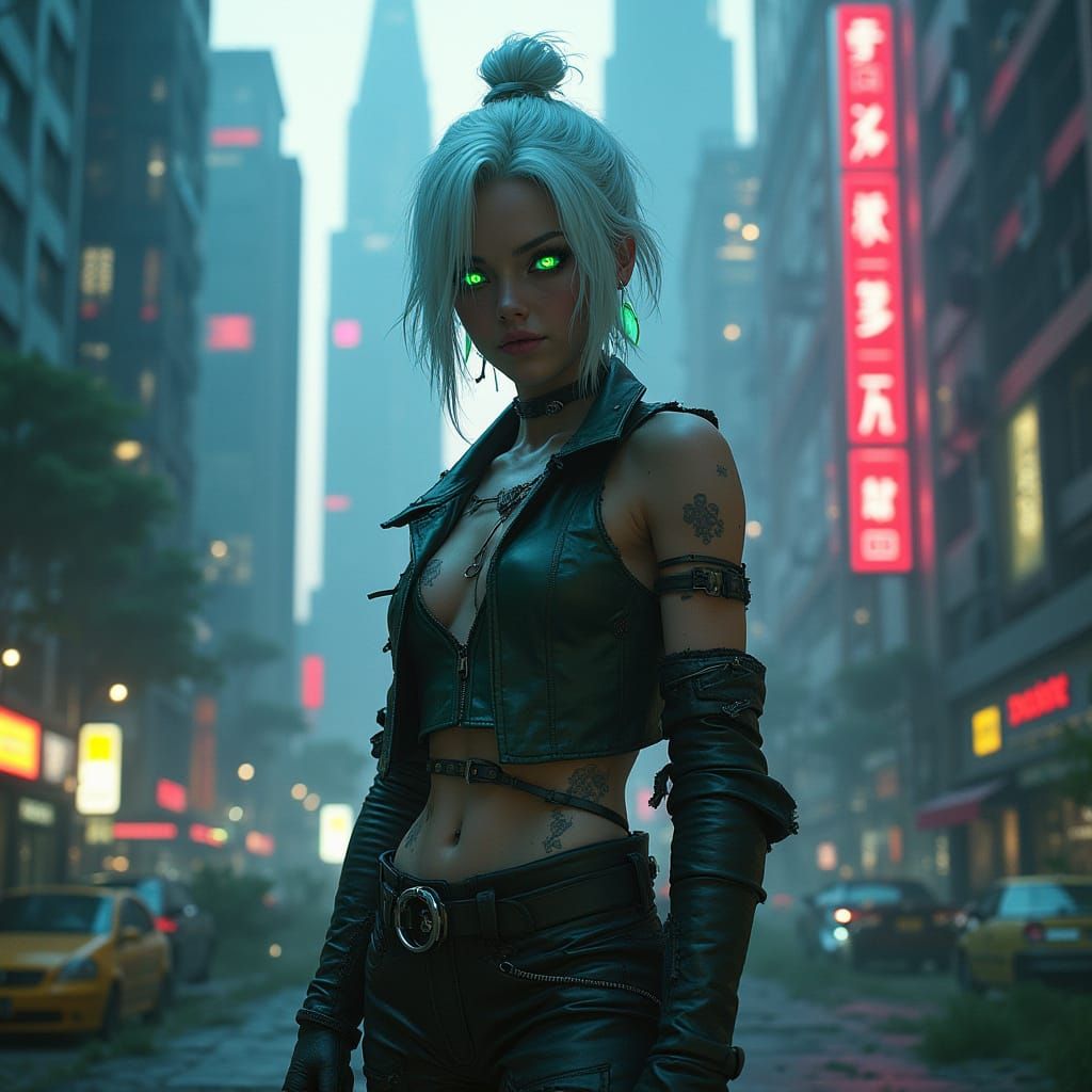 A striking image of a strong female figure standing assertively in a reclaimed cityscape at dusk, surrounded by vibrant neon lights and lush foliage, blending photorealistic textures and cinematic details