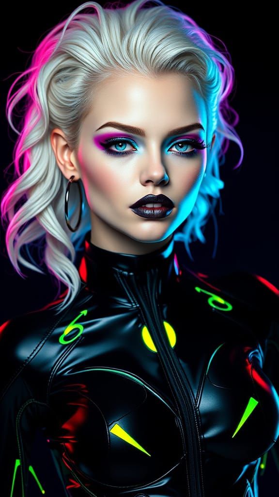 This striking portrait shows a woman with porcelain skin and platinum hair, set against a dark background with vibrant neon accents and a futuristic black leather bodysuit, exuding a retro-futuristic vibe with hyper-realistic detail.