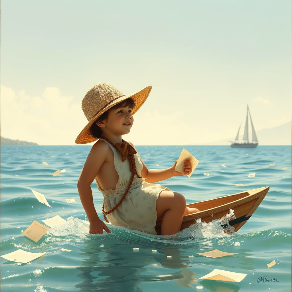 This image shows a child in summer clothes throwing paper boats into the sea, surrounded by scattered letters, on a sunny summer day. The image blends realism and romanticism with urban art elements.