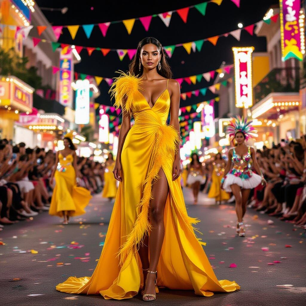 A striking picture of a confident fashion model in a yellow dress at a vibrant carnival. The scene is full of colorful banners, streamers, and confetti, with dancers and music in the background.