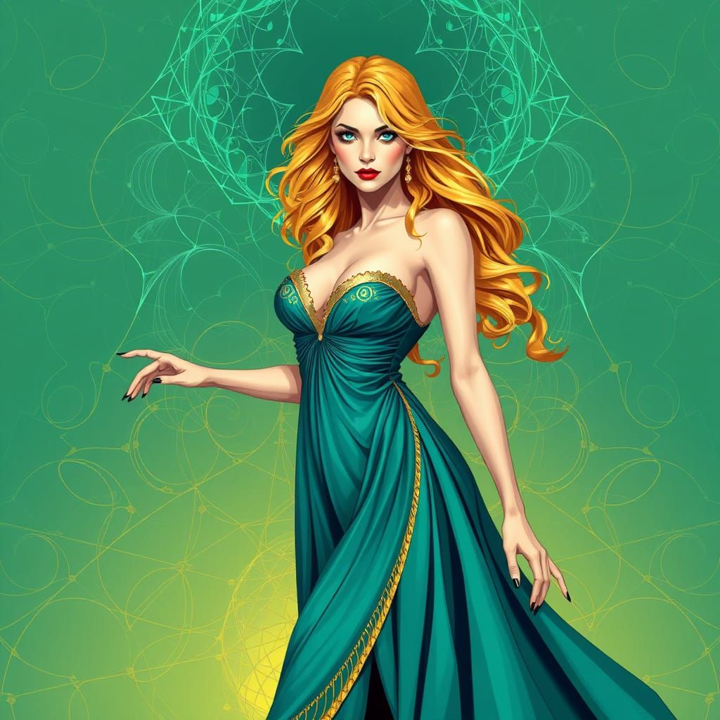 A striking picture of a fierce vampire woman with golden hair at a gala. She wears a flowing teal nightgown featuring geometric patterns and 3D shading in a vector fractal style.