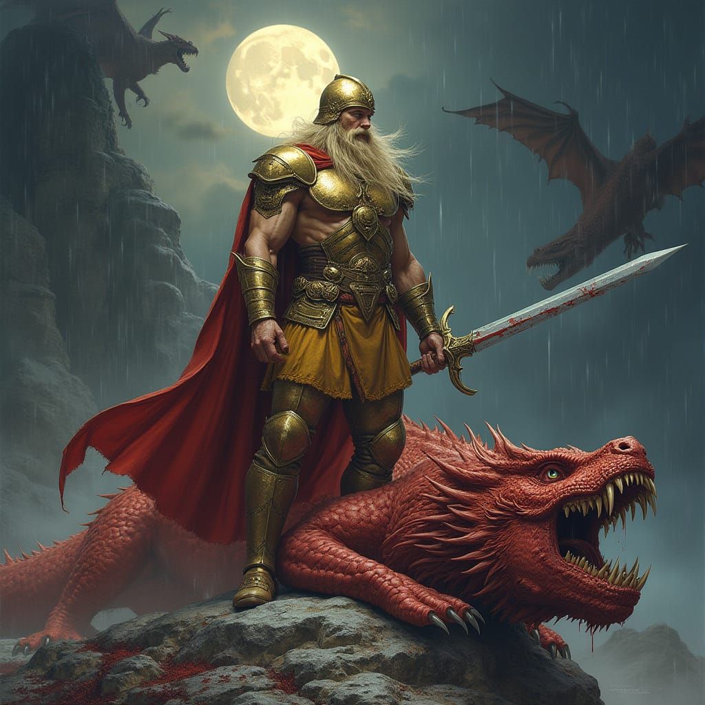A triumphant Norse warrior, Sigurd, stands over a defeated red dragon under a full moon. The digital artwork depicts a dark, rainy night filled with flying dragons, rendered with heroic fantasy painting techniques.