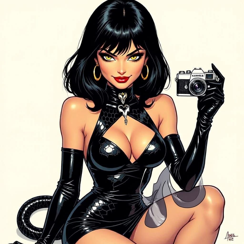 This striking image features a slender woman with dark hair and yellow snake-like eyes, dressed in a black leather outfit. She grins slyly while holding a miniature camera, rendered in a comic art style.
