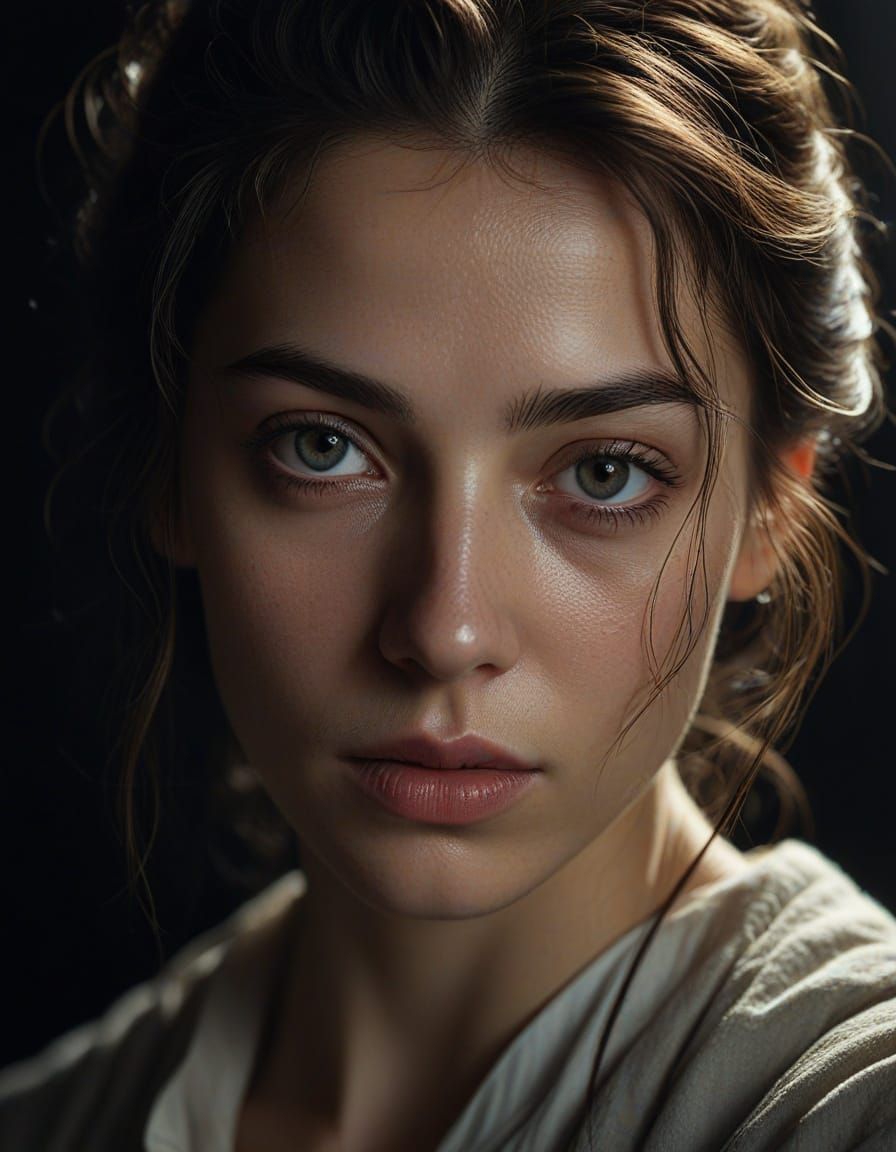 This captivating portrait captures a woman's enigmatic aura in a soft, moonlit setting, with delicate shadows and gentle, cinematic lighting, reminiscent of masterful artists and precision photography.