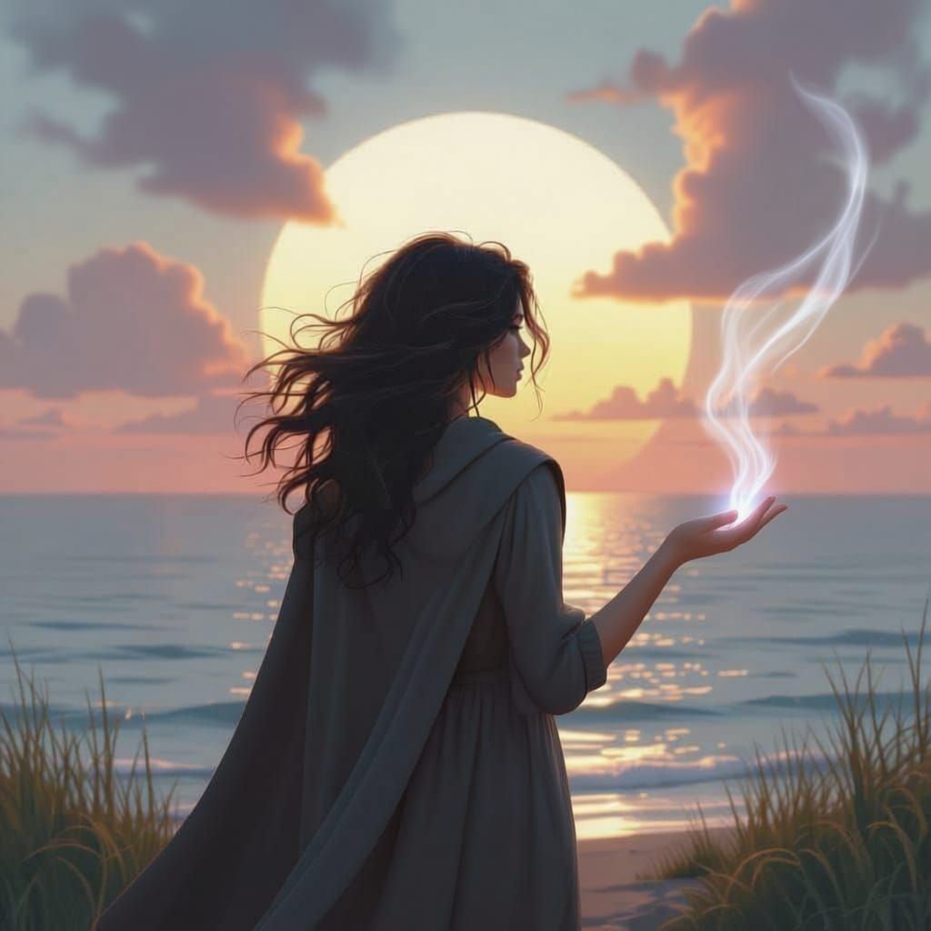 A captivating image shows a woman with flowing hair gazing at the sea during a vibrant, fantasy-themed sunset. The scene is bathed in a silver glow, creating a dreamy atmosphere.