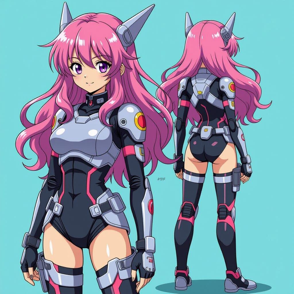 A vibrant image of a manga-style girl with curly lilac hair, clad in futuristic combat gear. The artwork features expressive lines and a bright color palette, rendered as digital art.