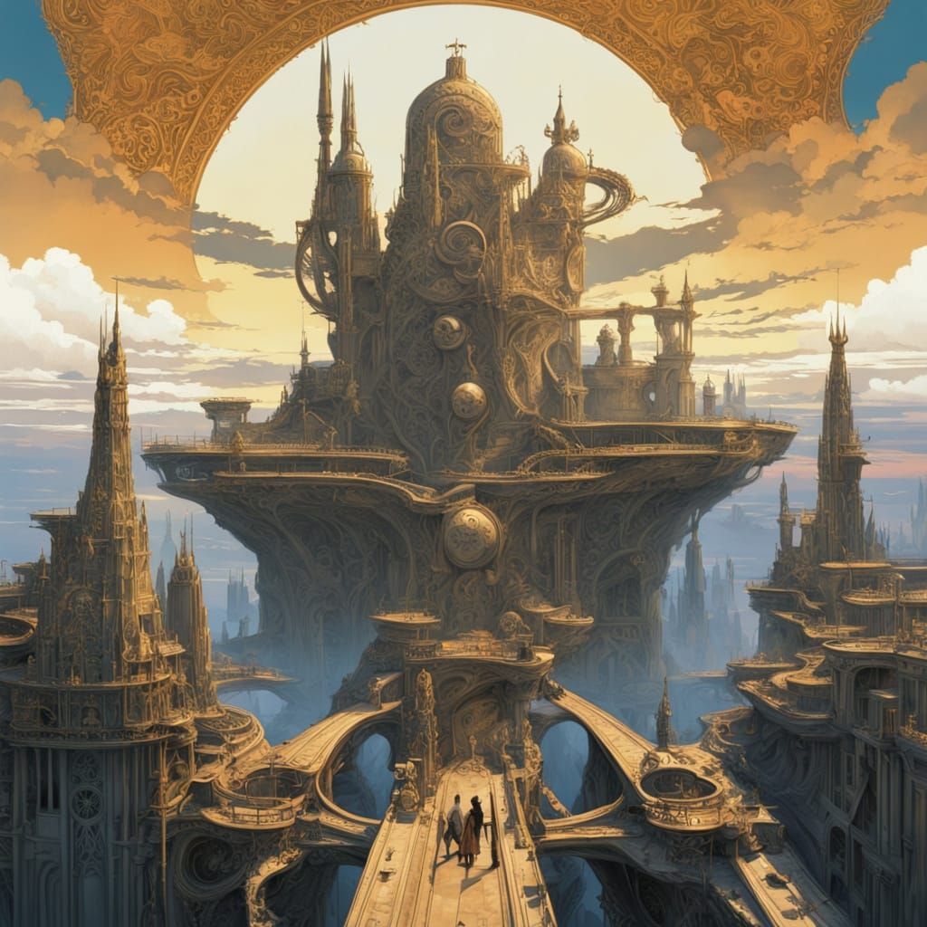 Art nouveau. A majestic thing, adorned with intricate brass gears and glowing ethereal filigree, stands guard over a sprawling futuristic city at twilight. Medium shot. Detailed illustration with flowing lines and organic forms. . A sense of ancient power and advanced technology. Art Nouveau influences, ...