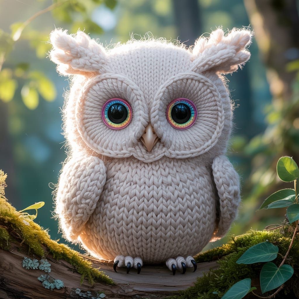 This image shows an adorable baby owl portrait, intricately crafted from knitted yarn. The owl has big rainbow eyes and sits on a mossy branch in a softly lit forest, creating a dreamy ambiance.
